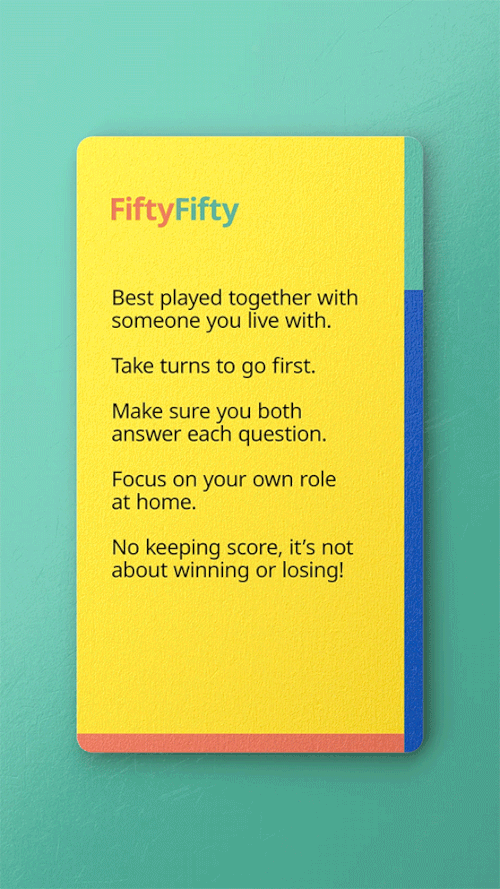 FiftyFifty takes partners, roommates, friends and co-workers on a journey to explore the roles and dynamics in our homes in a more positive way, asking questions that promote sharing and understanding.